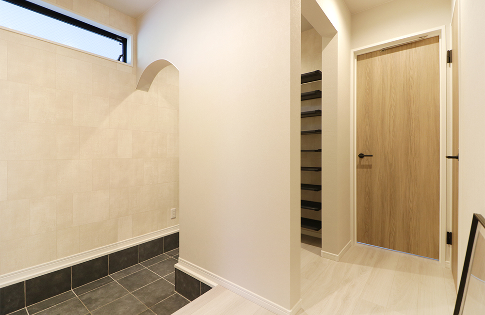 ご家族用とお客様用で分けた2WAY仕様の玄関。ラフに靴を脱いでも大丈夫なご家族用と、いつでもスッキリを保てるお客様用で分けました。ご家族用の玄関には、大容量のシューズクロークを設け、R垂れ壁で仕切りました。ベビーカーやゴルフバッグも置け、扉の無いウォークスルータイプなので、外出時はさっと手に取れ、帰宅時はすぐに片付けられる、スムーズな動線です。