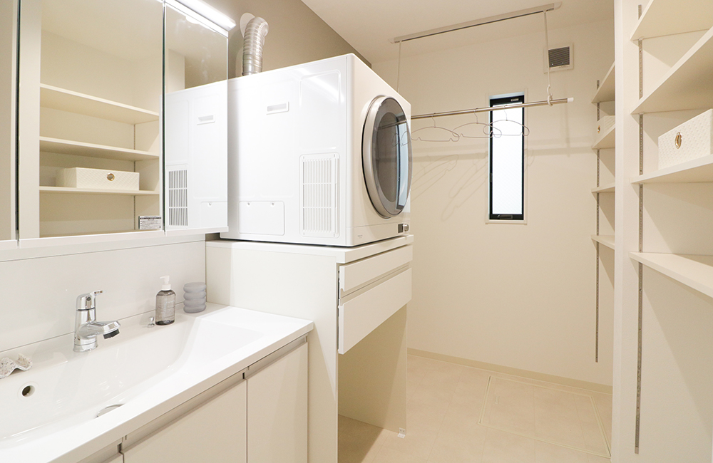 洗濯時間を少しでも短縮できるよう、乾太くん(ガス乾燥機)を「スライド天板付きの設置棚」に据え、乾燥機から出したものをすぐ畳めるようにしました。乾燥機にかけたくない、大事なお洋服や大きなものは、すぐ横の「室内物干し」や「浴室乾燥機」に干せばOK。洗濯室内にタオルや下着類など、お風呂上がりに必要なものをしまえる「可動棚」も備え、『干す・乾かす⇒畳む⇒しまう』までの動線を短くし、家事の時間を短縮できるようにしています。