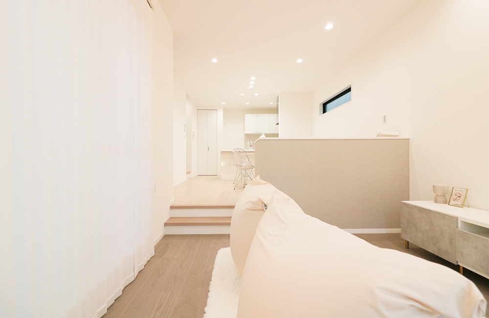 白を基調にしたシンプルな内装で『すっきり』、スキップフロアで『抜け感』が感じられるお家が完成しました。空間を高低差やスタディカウンターでゆるく仕切ることで「開放的」に、収納も兼ね備えたリラックスベンチで「居心地良く」、様々な動きで空間に変化をつけました。忙しいくらしの中、家事や生活が時短できるよう、「洗濯が1か所で済む洗濯室」や「料理や家事をしながら、家族の様子が伺えるキッチン」「出かける準備のしやすいクローゼット」など、たくさんの工夫を散りばめました。シンプルをテーマにしたお家ですが、寝室のクローゼット入口をR垂れ壁にしたり、キッチンには天然石を組み合わせたタイルを施し、リビングの床だけ少し濃い目の突板のフローリングにするなど、さりげないディティールにこだわり、住むほどに人に寄り添う、そんなお家にしています。