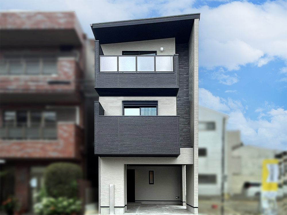 グレー×ブラックの石目調をベースにした、重厚感あるシンプルな外観。インナーガレージになっていて、玄関前のスペースも広くとっているので、自転車なども置きやすく、雨の日にも濡れずに車の乗り降りもできます。
