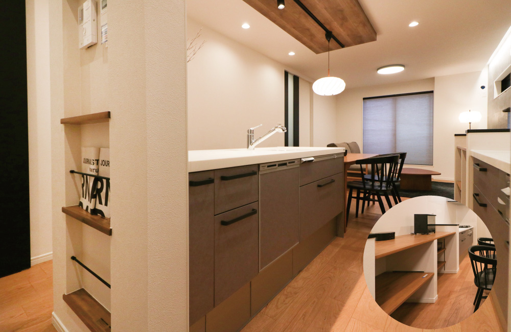 動線のコンパクトなⅡ型キッチンを取り入れた、オープンで明るいキッチンスペース。横並びにダイニングがあるので、テーブルに子どもを座らせ、調理しながら食事をさせたり、ながら家事も可能に。ダイニングテーブルの背面には、食器や家電類を収納できるインテリアカウンターをご用意し、振り返るだけで食器を用意したり、ご飯をよそうのもラクちんに。おしゃれと使いやすさを兼ね備えたキッチンにしています。