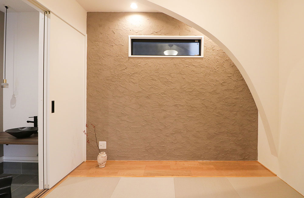 土間からも廊下からも出入りできる和室スペース。弧を描くようR垂れ壁をあしらい、モダンな印象に。柔らかない草の香りが心地よく、ついついゴロゴロとくつろぎたくなる畳の空間は、子どものプレイルームや趣味の部屋、来客用の寝室にも最適。訪れた人がリビングまで上がらなくても、「まあ座ってください」と腰掛けてもらってお茶を飲んだり、お話しをしたり、気軽に過ごしてもらえる「おもてなし」の場所としても◎さまざまなライフスタイルに心地よくフィットしてくれるお部屋です。