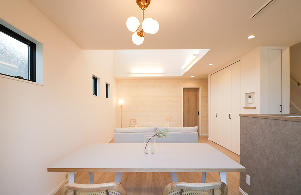 南に開けた大きな吹抜けで、開放感ある明るいLDK。吹抜けを通じて、3階で過ごす家族の様子も感じられ、外出や帰宅時にはリビング階段をとおり、「ただいま」と「おかえり」が言い合え、リビングに居るだけで、常に家族の存在を感じられます。柔らかいくすみ系グレージュのフローリングや建具に合わせて、ホワイト・ベージュ・グレーに色目を統一し、木目や石目などの素材感を感じさせる内装で、やさしいカジュアルテイストにしています。照明に、ゴールドのアクセントを取り入れ、カーテンやラグには、空間になじむ素材感あるものを選び、可愛らしくも大人っぽいイメージをプラスしました。