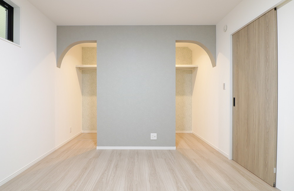 主寝室のクローゼットは、左右どちらからでも出入りできる、ウォークスルータイプのオープンクローゼットにしました。双方からの風通しが良く、お掃除もラクになり、明るい空間のなかでコーディネートを考えられます。入口をアーチ垂れ壁にして、見た目もたのしく、旦那さま側と奥さま側で、お洋服の住み分けもしやすくなりそうです。