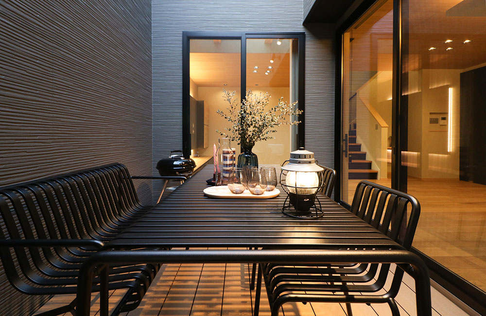 木の風合いとお日さまの温かさあふれるLDKの真ん中に、中庭みたいなバルコニーを設けた「アウトドアリビング」のある家が完成しました。お部屋の一部のように外と中を行き来でき、LDKとバルコニーで家族が互いを感じながら、心地よい距離感で過ごせます。リビングは、天井にも床にも天然木突板を使用した、木の風合いがあふれる空間。キッチンを折下げ天井と間接照明でふんわりゾーニングし「居心地の良さ」を感じられるように。スタイリッシュなブラックキッチンや、リビング階段のブラックアイアン手すりでキリっとアクセントを効かせ、ホテルみたいな「上質さ」も演出。他にも、お家を清潔に保てる、玄関横に洗面室を設けた「帰宅動線」や、趣味や仕事に集中できる「書棚のある書斎」。家事の合間にホッと一息つける、キッチン内の「ワークカウンター」などの、生活しやすい工夫を揃えています。住宅内で使用する電力を自ら創出したエネルギーでまかなえるように考えられた「ZEH-ゼロエネルギーハウス」を採用し、快適な温度と湿度、結露のないきれいな空気の中で生活でき、ダブル発電で電気代も抑えられ、災害時も安心。上質で暮らしやすく、環境にやさしい生活ができるお家です。