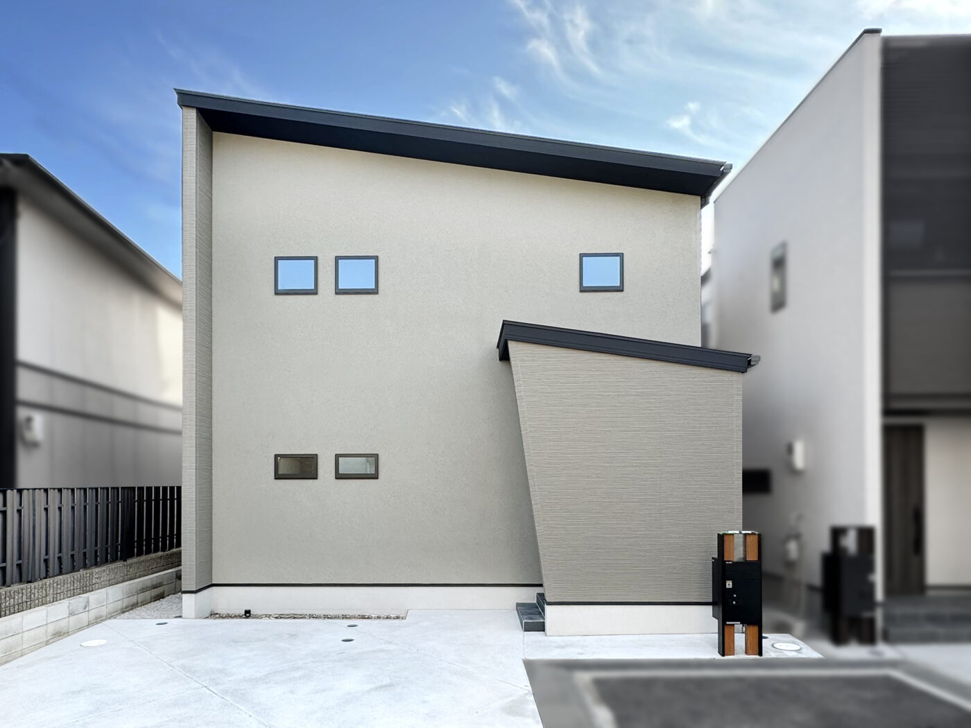 大きな窓が少なく、外から中が見えずらい、すっきりとしたシルエット。グレーのサイディングと、ジョリパットのビオラ仕上げの、温かく優しい風合い。個性的でおしゃれな外観は、暮らしやすく、愛着を持って住み続けられるデザインです。(ジョリパット ビオラ仕上げ:塗料に砂を混ぜて作った「モルタル外壁塗装材」を吹付け、竹ボウキで模様をつけています。)
