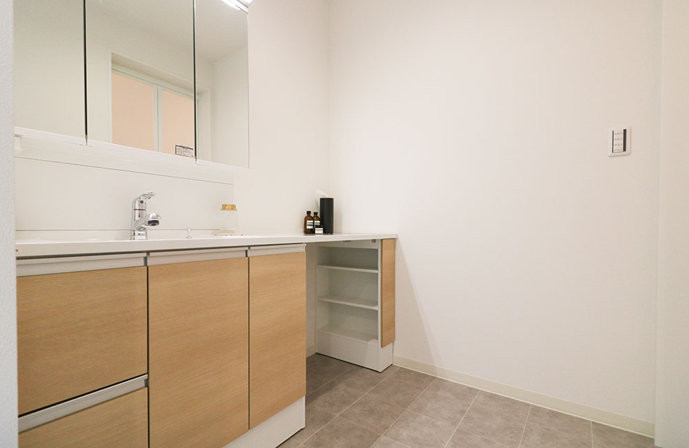 日当たりの良い1階に、約2.4帖の部屋干しができるランドリールームをご用意しました。ファミリークローゼットとしての収納と、乾燥機も用意すれば、「洗濯→干す・乾燥→収納」までを1か所で完結できます。隣接した洗面台は1.8mと広めで、収納も充実したものをご用意。お風呂上がりのお手入れも、朝の支度もゆとりを持ってできます。玄関から入ってすぐの場所にあるので、帰宅してからの「手洗い・うがい→着替え」までがスムーズになり、子どもが汚れて帰ってきても、着替えを取りに行く手間もなく、シャワーできれいにでき、他のお部屋を汚さずにすみます。