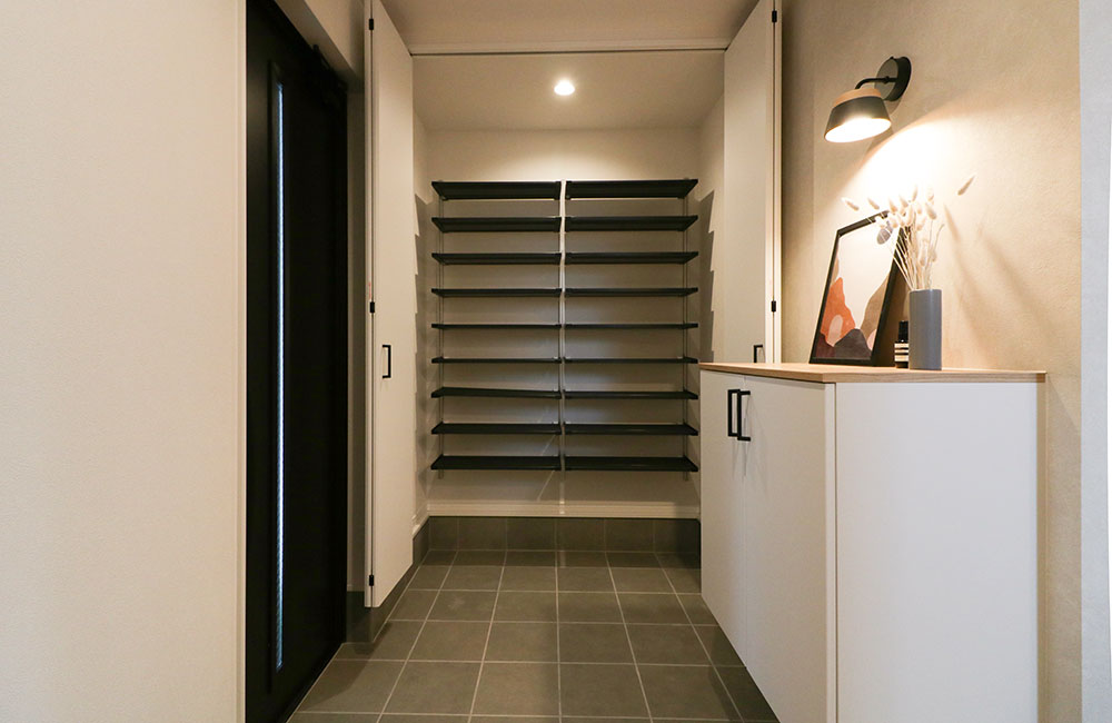 土間収納のシューズクローゼットと、フロートタイプのシューズボックスを備えた広めの玄関。シューズクローゼットは奥行きを深めにとり、収納力もたっぷりと。ベビーカーや、外遊びのおもちゃやアウトドアグッズ、ゴルフバックもしまえ、ゴチャつきがちな玄関もスッキリと片付きます。