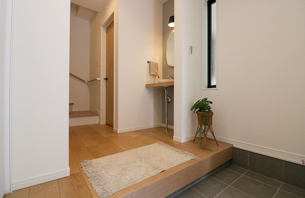 帰ってきてすぐ「手洗い・うがい」が出来、お客様にもためらわずに使っていただける『ただいま手洗い』と、ベビーカーもそのまま置ける『ひろびろ玄関』。ただいま手洗いは玄関脇にあるので、手洗い習慣も付きやすく、主寝室からも近いので、寝る前や身支度の時に、わざわざ2階に上がる手間も省けます。また、お客様を迎えるスペースに設置しているので、インテリア性のある洗面ボールとブラケットライトを選び、土間にベンチや観葉植物を置いたり、コーディネイトを楽しめる玄関にしました。
