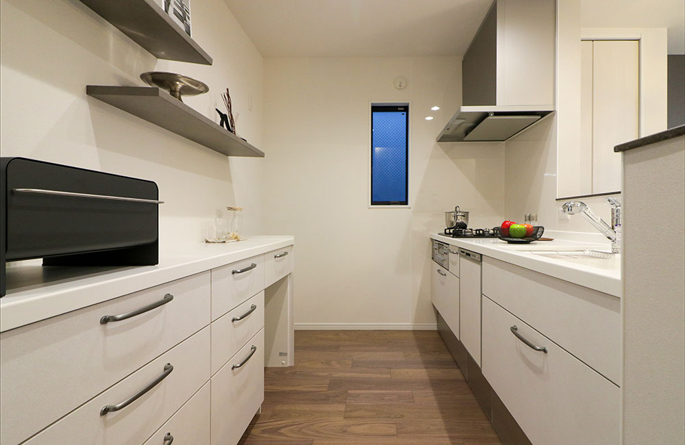 作業中の手元を腰壁で隠し、冷蔵庫やコンロも壁で見えないようにしつつもLDKが見渡せる、開放感あるキッチン。家族の様子を見守りつつ、家事をこなしやすいつくり。振り返るだけで手の届く、インテリアカウンターと飾り棚には、お気に入りの食器や家電をディスプレイしながら収納。腰壁の笠木には、手触り・質感・光沢を感じられる、天然水晶を主成分にした人造石を施し、飾り棚も同色の石目柄を使用し、上質な雰囲気に。おしゃれに飾りながら、お料理もしやすいようにしています。