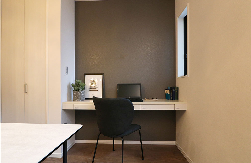 ダイニングにあるワークカウンター。キッチンから目の届くところにあるので、子どもが宿題したり、ちょっと作業がしたい時やご家族で使うPCコーナーにぴったりです。カウンターがあることで、ごはんが出来て配膳しよう!という時に、ダイニングテーブルの教科書や作業中の書類の片づけから、ということもなくなりそう。引出し収納も備えているので、細かいものの収納もできて、いつでもスッキリを保てます。