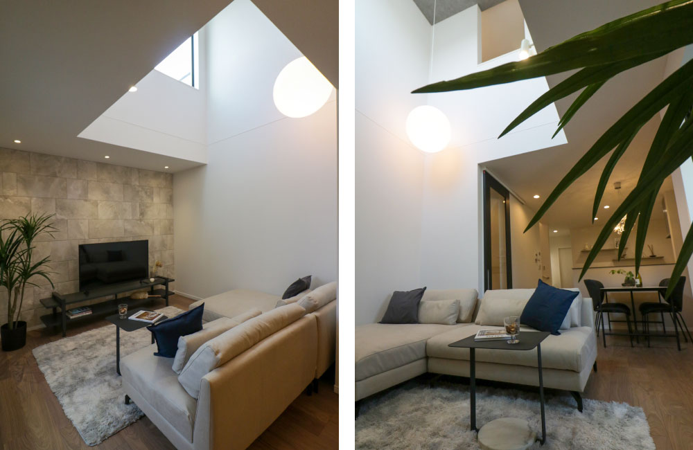 素材感と質感をアクセントに取り入れた、上質なデザインをテーマに、コンパクトにまとめた動線計画と、広く開放的に生活スペース。空間を有効に使った収納計画など、快適な暮らしをサッサ得るこだわりが詰まったお家になるよう計画。室内に入った時に広がりと明るさを印象付ける間取りになるよう、玄関土間を広く取り、リビングには吹抜けを採用しました。