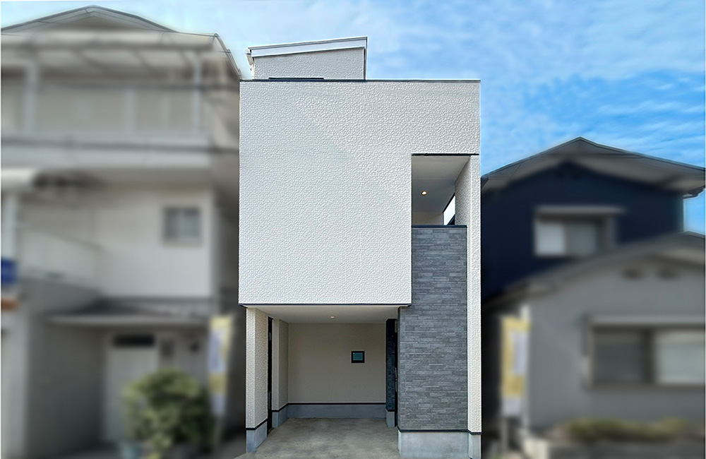 アイボリーカラーを基調とした、シンプルモダンな外観。引き締めカラーとして、リアルな質感にこだわった、石目柄の外壁をプラスし、上質は印象に。玄関前に目隠しになる壁を施し、外からの視線を気にせず過ごせ、見た目もスッキリ。インナーガレージになっているので、雨に濡れずに、車の乗り降りや荷物の上げ下ろしもできます。