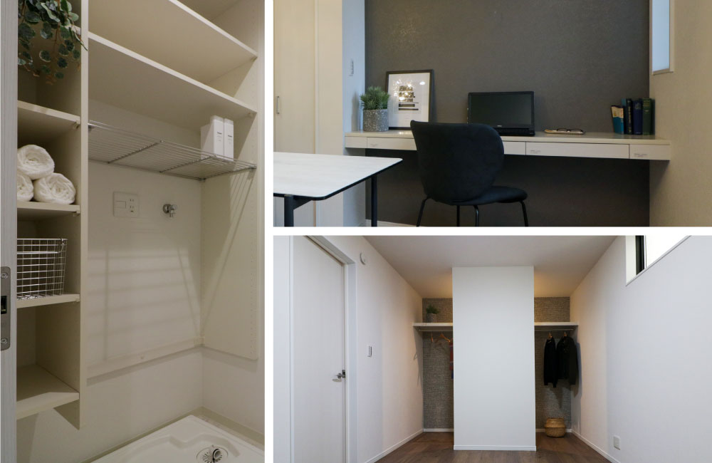 家族が自発的に片づけができ、家を常にきれいに保てるよう、生活動線上に最適な収納スペースを施しています。それぞれが持ち物を管理しやすいよう、各居室にはウォークインクローゼットを完備。リビングの収納内には、電源を備えて、掃除機の充電やルーターにも対応できるように。引き出し付きのワークカウンターや、脱衣所にも間口にぴったり合わせた造作収納を施し、デッドスペースを活用しながら、適材適所に収納を設けています。生活動線上に収納あることで、アイテムの出し入れがスムーズになり、日常生活の無駄な動きが抑えられ『家事軽減』に繋がるようにしました。