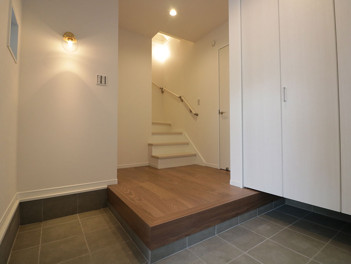 奥行きと広さを感じられるL字型の玄関スペース。上がり框をL字にすることで、「ゆとりを持って並んで靴を履きやすく」「ベビーカーも置きやすく」なり、お出かけがスムーズに。土間部には、ベンチや棚をを置いて、ディスプレイコーナーにしたり、植物を飾っても素敵です。シューズクローゼットは土間収納になっているので、アウトドア用品やお子さんの遊び道具、災害時のための防災グッズを置く場所にも適しています。