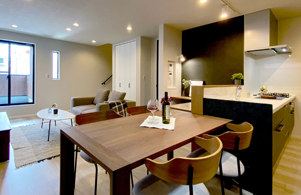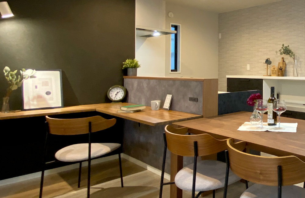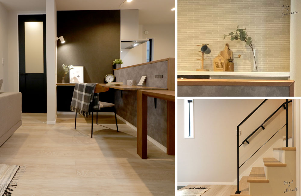 キッチンを中心に家族がLDKに集まり「自然に会話が弾む」お家が完成しました。キッチンのすぐ横にダイニングテーブルとカウンターがあり、夫婦でお酒を飲みながら料理をしたり、食器を洗いながら子どもの宿題を見たり、出勤の支度をしながら朝食を準備したり、配膳や後片付けもすぐ横に置くだけで簡単に。ワークカウンターはL字型になっており、PCコーナーと子供の宿題コーナーに分けられる広さなので、ダイニングと合わせて大人数での食事もできます。軽やかな木目と白をベースに、黒やグレー、コンクリートやタイルなどの素材を感じさせるクロスやブラックアイアンの手すりなどで、少しインダストリアルなテイストを加えた内装は、カフェみたいな雰囲気。一緒に食事の準備や後片付けを行うことで、家族の連帯感が高まり、キッチンを中心に人が集まり自然に会話が弾む、そんなお家にしています。