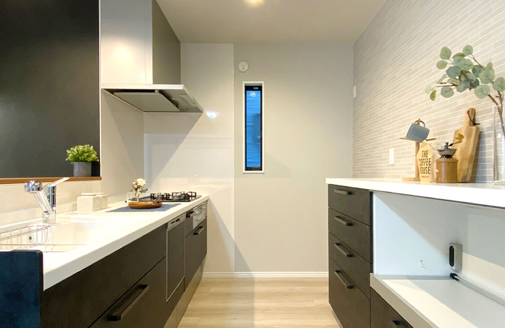複数人が並んで調理できるⅠ型キッチンに、カップボードと壁一面にパントリーを備えた、収納力もある使いやすいキッチン。調理中の気になる匂いや油の飛び散りも、前面が壁になっているので気にせず料理ができ、来客があっても冷蔵庫やゴミ箱も奥に見えづらくなっていて安心◎ブラックのヴィンテージメタル柄のキッチンとタイル調クロスで、ちょこっとインダストリアル風のキッチンに仕上げました。