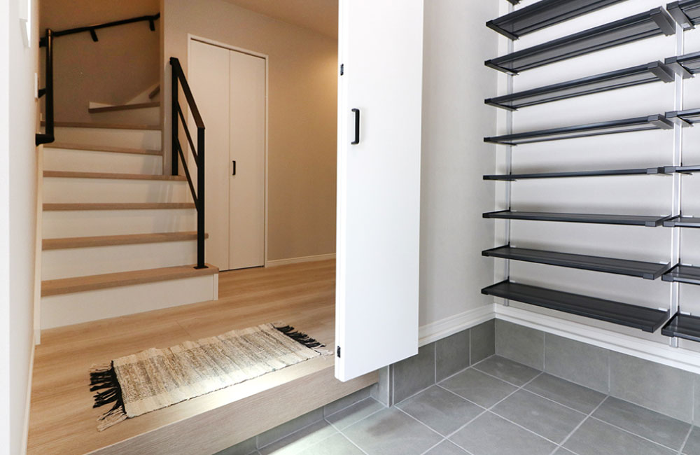 毎日帰ってくるのが楽しくなる、かわいいブラックアイアン手摺りのある玄関は、おしゃれなだけでなく収納力も◎ 奥行のあるシューズクローゼットは、土間収納になっていて、靴はもちろん、棚板を外せばベビーカーやゴルフバックなどもそのまま収納できます。階段下にも収納があり、ゴチャつきがちな玄関もすっきり片付き、いつもきれいな状態でお客様をお迎えできますね。