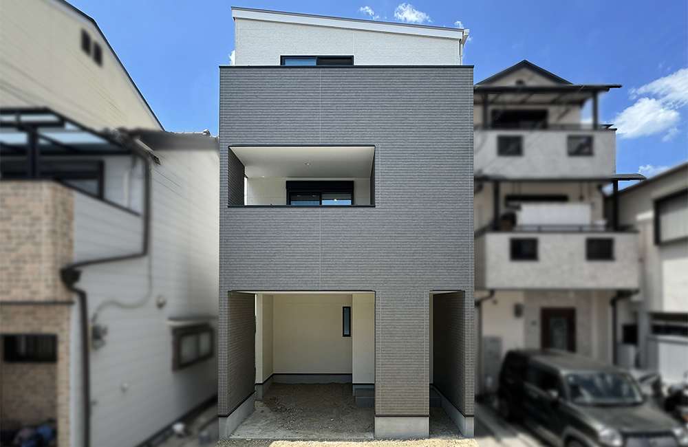 ホワイト×グレーをベースに窓枠のブラックオークでアクセントを加えた、シンプルながらもナチュラルでかっこいい外観。インナーガレージになっていて、玄関前のスペースも広くとっているので、自転車なども置きやすく、雨の日でも濡れずに車の乗り降りもできます。