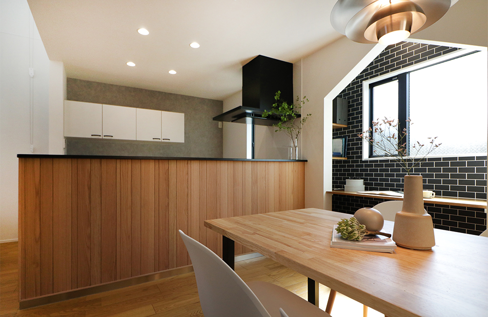 オークの天然木を床や壁などにふんだんに使った、木のぬくもりを感じる家が完成しました。リビングに入るとまず目を引く、腰壁をぐるりと板張りにした、カフェのようなキッチン。床にはオークの突板を使い、脚ざわりも心地よく。アクセントにブラックを加え、木×ブラックのナチュラルかっこいいテイストに仕上げました。LDKは、3階とつながる吹抜けとリビング階段で、家族が自然とコミュニケーションが取りやすいつくりにしています。サンカク垂れ壁でゆるりと仕切ったカウンターや、リビングからは見えないセカンド洗面室、2か所に設けたウォークインクローゼットや適材適所の収納など、家族みんなが使いやすく、モノで溢れかえることなくスッキリ暮らすことができます。