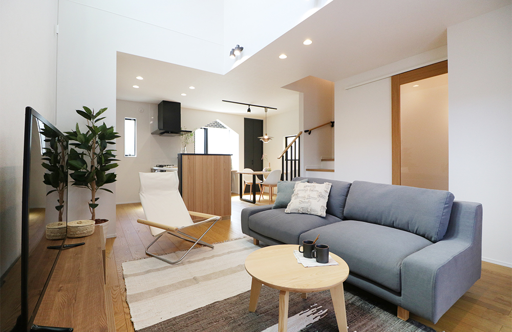 南面の大きな窓から吹き抜けを通して、心地よい光が降り注ぐ、明るく・開放感あるリビング。家族とのコミュニケーションがとりやすいよう、リビング階段にし、外出から帰った際には、必ずリビングを通るので「ただいま」と「おかえり」も言い合えます。キッチンから吹抜けを通して「ご飯できたよ~!」と呼べば「は~い」と返ってくるような、自然と家族がコミュニケーションが生まれる、そんな明るい空間です。
