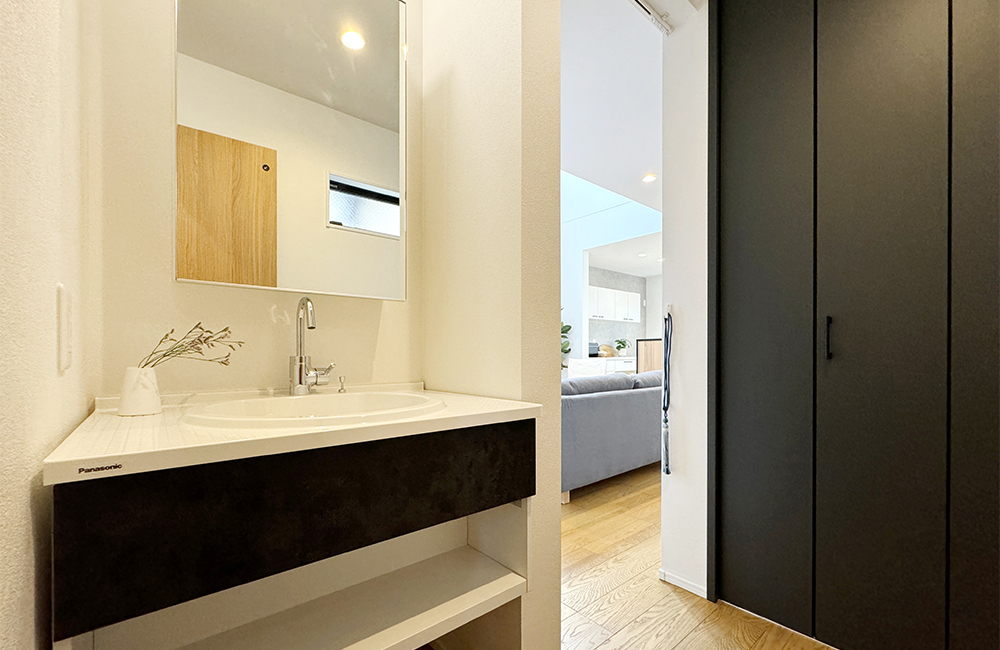 リビングのトイレ横にセカンド洗面室を設けました。リビングからは直接見えない半個室になっており、お客さまにも気兼ねなく使ってもらえます。扉付きの収納もあるので、収納場所に困る掃除用品やストック品、ごちゃごちゃしがちなメイク用品などもスッキリ片付けられます。また、1階の洗面室まで、階段を登り降りせずに使え、通勤・通学など重なる、あわただしい朝でも、1階と2階で分けて使えば、混雑を防ぐことができます。