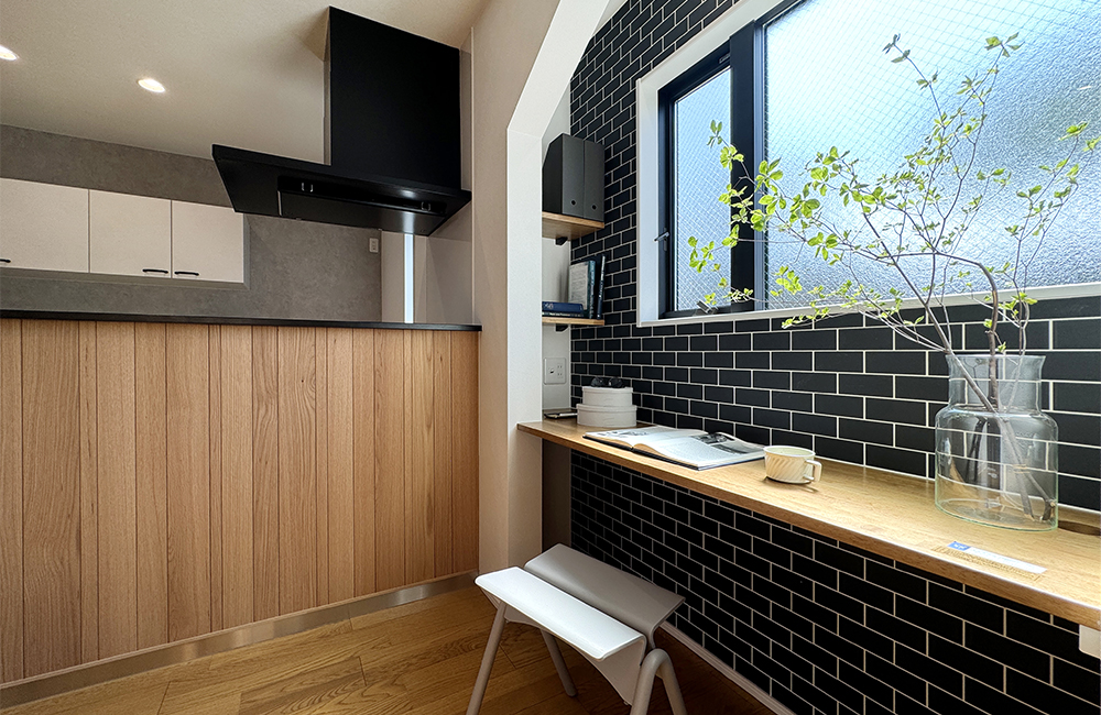 毎日使う場所だから、見た目も使い勝手にもこだわりました。腰壁には、オークの天然木(突板)を全面に施し、巾木部分はメタルを使うことで、木と調和させながらスッキリとした印象に。お気に入りのカフェを思い出させるような、木のあたたかみを感じるおしゃれなキッチンになりました。また、程よく壁を高くし、レンジフード前に壁がないので、キッチンで作業する人の手元の目隠しをしつつ、ダイニング側とのつながりも感じさせてくれます。吊戸棚付きのカップボードに加え、深型食洗器、お手入れ簡単なレンジフードを備えており、食事後の片付けも、おそうじもラクラクです。