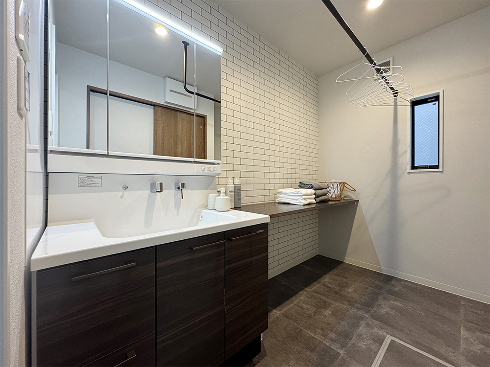 洗面室には、室内物干しを設け、ランドリースペースとしても使えるようにしました◎。できあがった洗濯物をたたんだり、アイロンがけができるよう、ワークカウンターもご用意。カウンター下に収納家具を設置すれば、下着類やパジャマ、タオルなどをその場で収納できるので、「洗う→乾かす→収納」がワンコーナーで完結できます。家事の時間が短縮でき、家族と過ごす時間が増えそうですね。