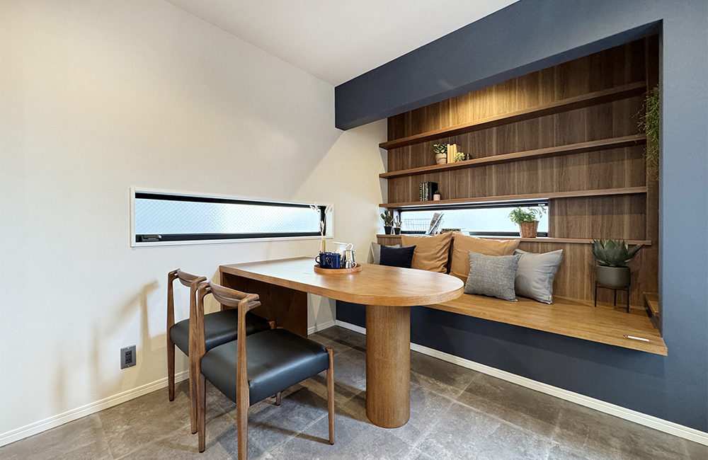 ダイニングベンチと兼ね、木目柄とネイビーのクロスをあしらった、カジュアルで柔らかみのある「ヌック」を設けました。ヌック内には、固定棚と可動棚を設けているので、子どもの絵本や趣味の本、漫画をたっぷり収納できます。お休みの日は、子どもと遊んだり、ゆっくりコーヒーを飲んだりと、家族の第二のくつろぎスペースになりそうです。