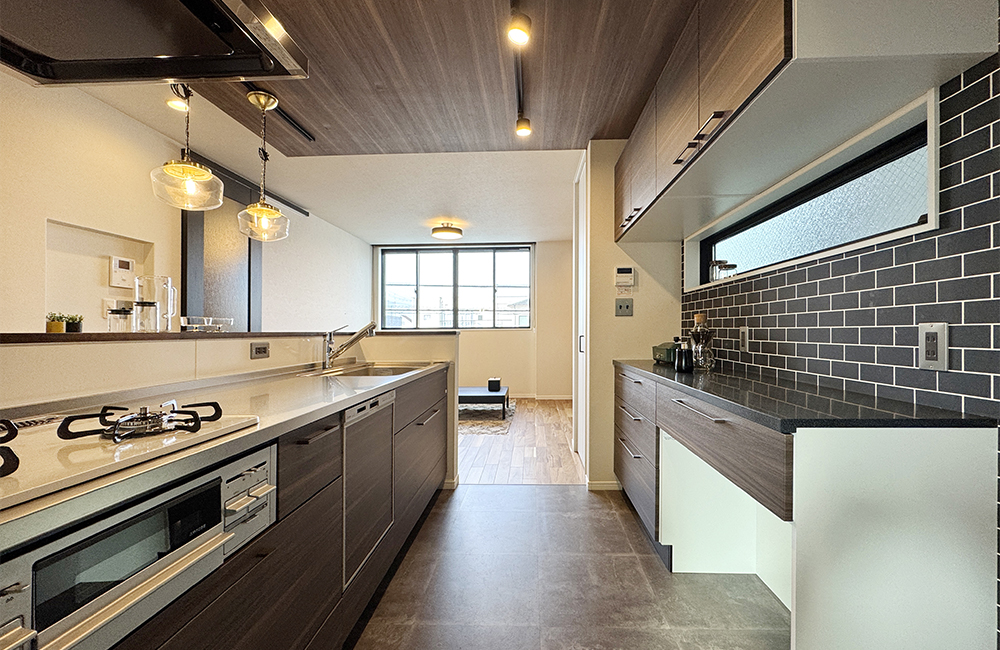 落ち着いた色味とマットな質感が魅力的な木目柄のアイランドキッチン。キッチンのワークトップには、ステンレスを採用し、床にはモルタル柄のフロアタイルを施しました。「見た目も美しく」「水と汚れに強く」「お手入れがしやすい」ようにしています。また、キッチンを中心に回遊できる動線で、家事などの移動距離を短縮し、朝の忙しい時間帯も家族の渋滞が起こらずスムーズに。ダイニング・リビングと隣接しているので、孤立せずにいつも家族の気配を感じることができます。