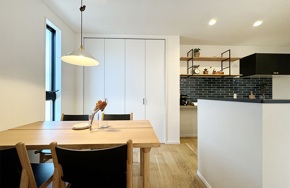 ダイニングがキッチンの横に並ぶように計画しました。コンパクトですっきりとした配置なので、LDKを広く使うことができます。回り込んでキッチンに行ったりダイニングテーブルに行ったりする必要がないので、料理の配膳も後片付けもスムーズ。子供をキッチン側に座らせれば、家事をしながら子供にご飯を食べさせることもできますね。