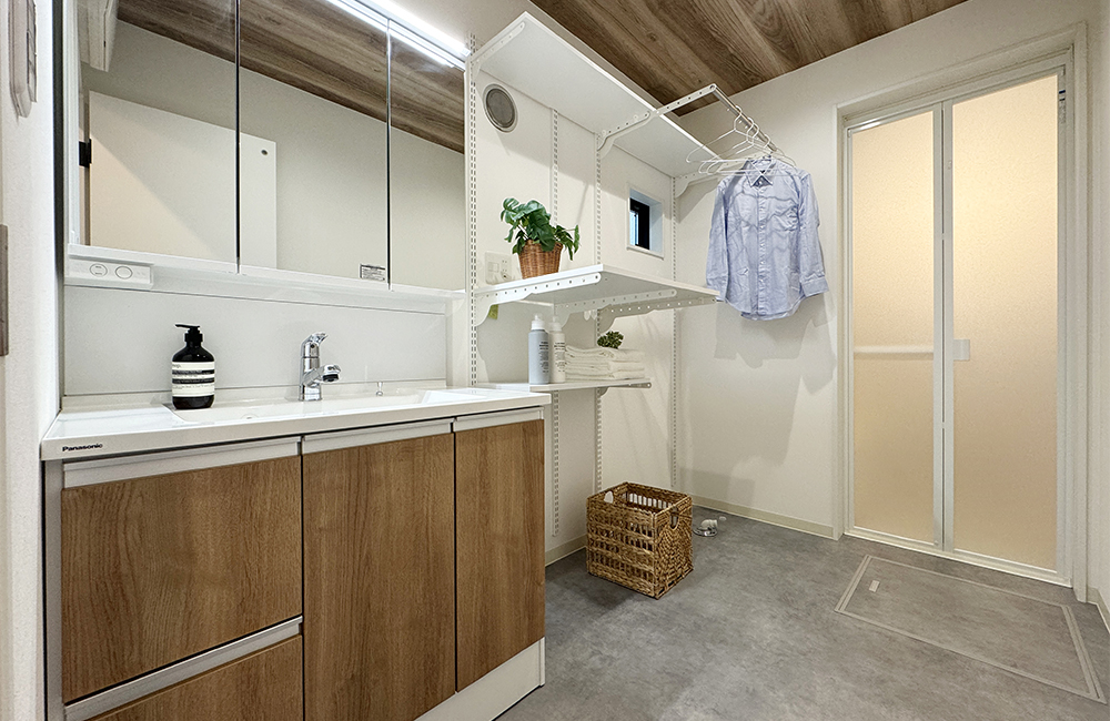 洗面室には、ガス乾燥機を設置できる可動棚があり、乾燥機を設置すればランドリールームとして「洗濯→乾燥」までが1箇所で完結できます。ふわふわに乾いたタオルや、お風呂上りの衣類は、備え付けの可動棚や洗面室に収納すれば、使い勝手も◎。ガス乾燥機を設置しなくても、棚板を増やして組み合わせれば、ライフスタイルに合わせた様々な使い方ができます。