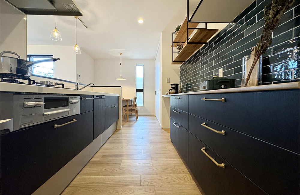 壁面にはヴィンテージ感あるタイルと飾り棚を施し、まるでオープンキッチンのカフェのような雰囲気。よく使うものや家電は手の届きやすい位置に、パッケージのかわいい食材やコーヒー道具、スパイスは飾りながら収納できます。カウンターの正面側は、見た目にこだわり、メープル柄の明るい木目をあしらいました。料理をしながら、リビングダイニングも見渡せ、横並びダイニングになっているので、テーブルにいる家族や友人との会話も楽しめます。