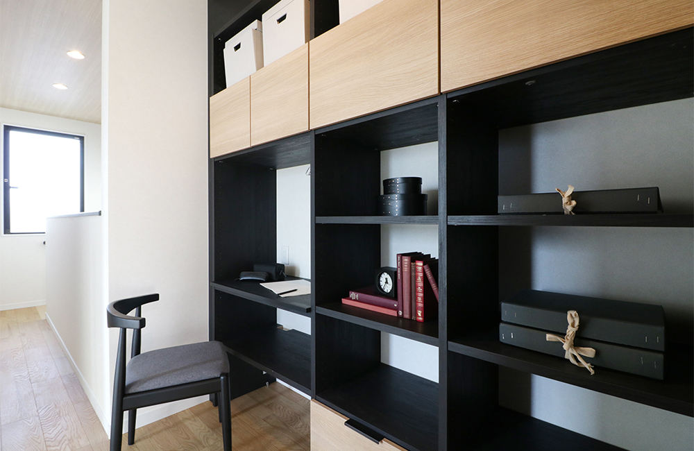 3階ホールに、収納をたっぷり設けたワークスペースをつくりました。壁に向かって設置しているので、余計なものが視界に入りにくく、集中力を高めやすくしています。子供の宿題スペースやパパママの在宅時に、ちょっと家族から離れて読書タイムにもおすすめです。吹抜けと背中合わせになっており、LDKにいる家族の気配を緩やかに感じることができます。