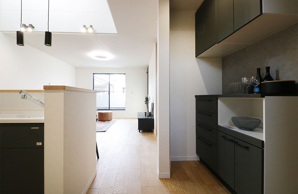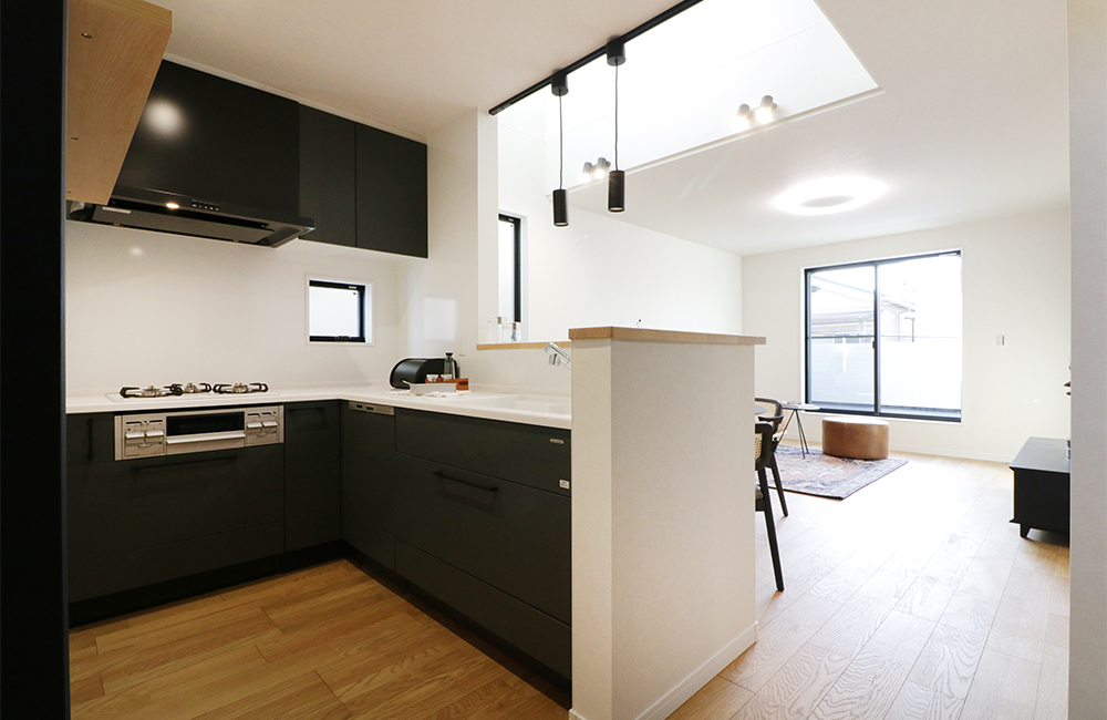 やさしい色柄の木目とマットな質感のブラックを組み合わせた落ち着いた大人な印象のナチュラルスタイルに、自然光をたっぷり取り込む工夫と、無駄のない動線計画を組み合わせた、明るく快適に暮らせるお家を計画しました。敷地裏が開けた立地だったので、上部から自然光を取り込む工夫としてLDKの中央に吹抜けを設けています。また、L型キッチンの採用で、収納量と作業スペースを広く確保しながら、コンパクトで無駄のない調理動線を実現。ダイニングやリビングとのつながりや開放感を感じるよう、シンク側が対面になるようキッチンを配置し、リビングダイニングにいる家族とのコミュニケーションもとれるようにしています。