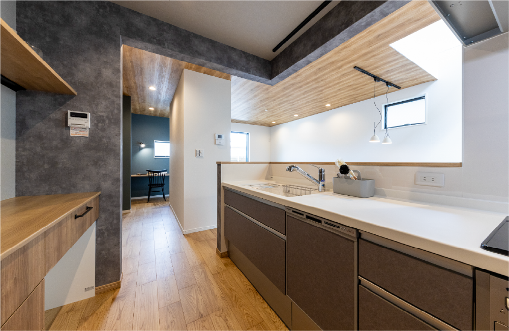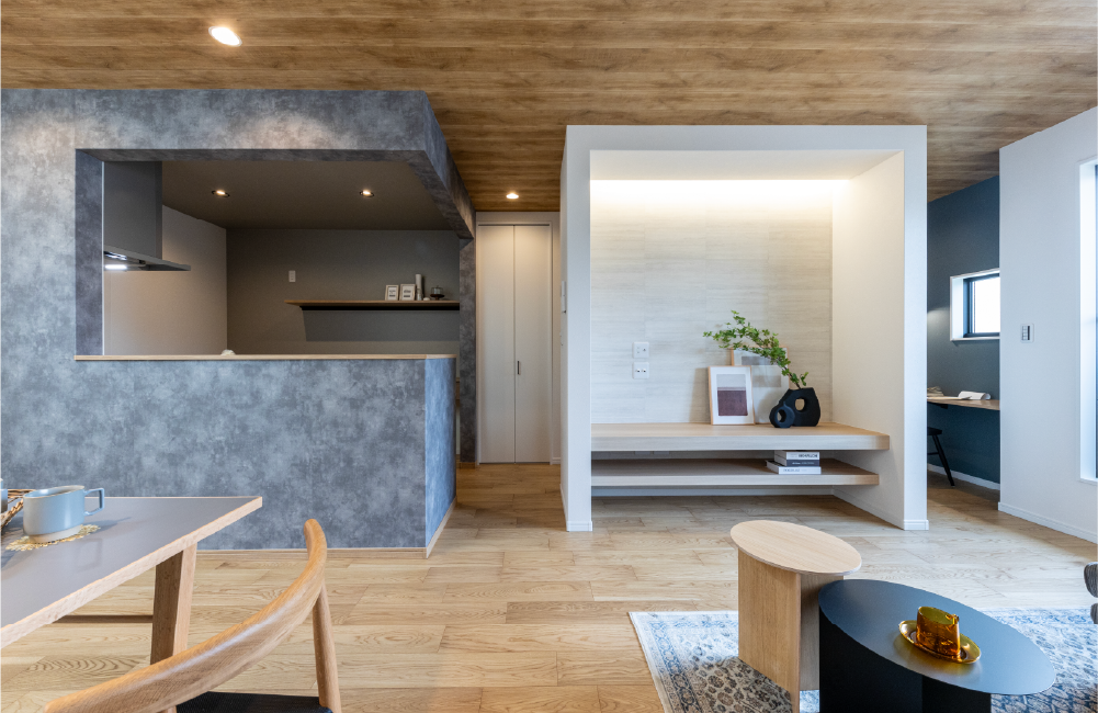 キッチンを囲む壁を「グレーのクロス+垂れ壁+折り下げ天井」でゆるく仕切られ、ちょっと個室感のある空間にしました。こもり感があるのでお料理に集中できて、「来客が多く生活感を見られたくない」という方にぴったり◎。また、キッチン背面にはオープン棚を設けました。使い勝手が良く、お気に入りの食器や調理器具を飾れば、キッチン空間をより楽しく、おしゃれに演出できます。