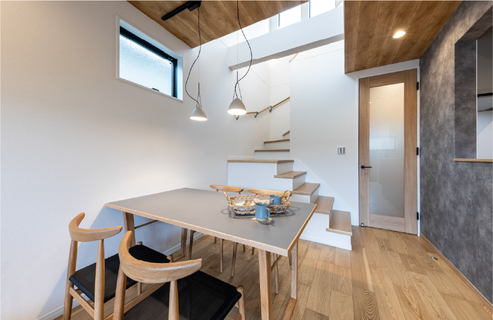 リビングには、生活感が出るものをまとめて収納できるテレビ裏の収納スペースや、スタディコーナーを設け、回遊できる動線とすることで、利用しやすく、スッキリと見せる間取りの工夫を行いました。2階建てに囲まれている敷地でしたので、3階の各部屋は明るく、吹抜け階段を利用して、2階にも南側から採光を取り入れる計画としました。また、階段の手摺を抜け感のあるアルミ手摺にしたことで、ダイニングがより明るく、居心地の良い空間となっております。