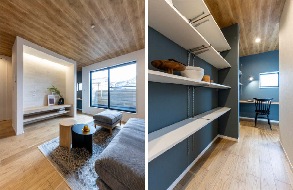 キッチン横には、回遊できるパントリー兼リビング収納を施しました。壁一面に可動棚を設けているので、ストック品から子どものおもちゃ、掃除道具など用途に合わせて、高さを変えられるようになっています。また、キッチンからもよく見える、リビングの一角に、スタディカウンターをご用意しました。料理中、子どもが宿題をやっていても、わからないところがあれば、すぐにかけつけられます。