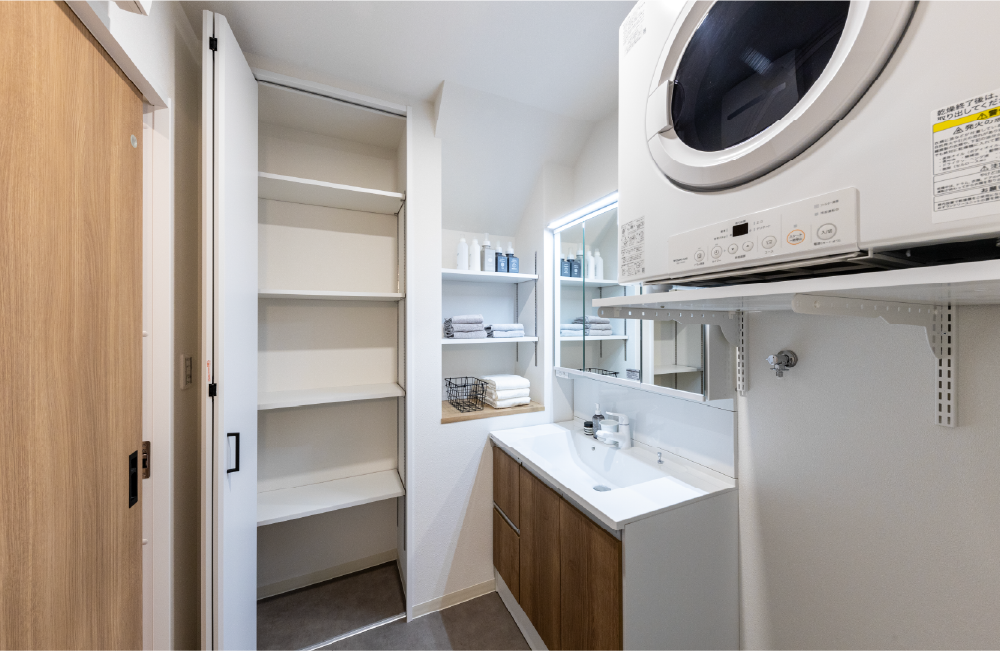 1階の洗面脱衣室に、乾太くん(ガス乾燥機)をご用意しました。洗濯したものをすぐ上にある乾燥機に入れることができ、お洗濯がラクに。サイドに扉付きの収納を備えているので、タオルや下着、パジャマなどを収納すれば、お風呂に入るタイミングで、必要なものがそろって便利です。また、サイドには、可動棚も設けたので、洗剤やストック品をスッキリ整理できます。