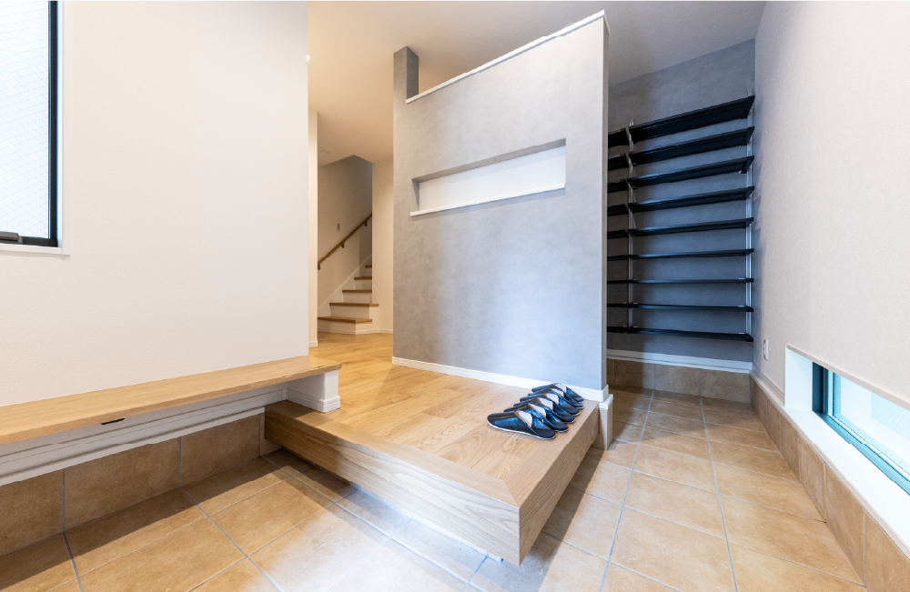 家族用とお客様用を分けられる2WAY仕様の玄関。入ってすぐのところに、ホールまで続く横長のベンチをご用意しました。子供を座らせて靴を履かせたり、来客時におしゃべりを楽しんだり、ちょっとした荷物を置いたりと様々な使い方が出来ます。玄関奥には、シューズクローゼットだけでなく、コートなどを掛けられるハンガーパイプも設けており、服についた花粉などを家の中に持ち込む心配もありません。また、玄関正面にはニッチがあり、思い出の写真や、好きなインテリアを飾ると、さらにおしゃれな空間に。