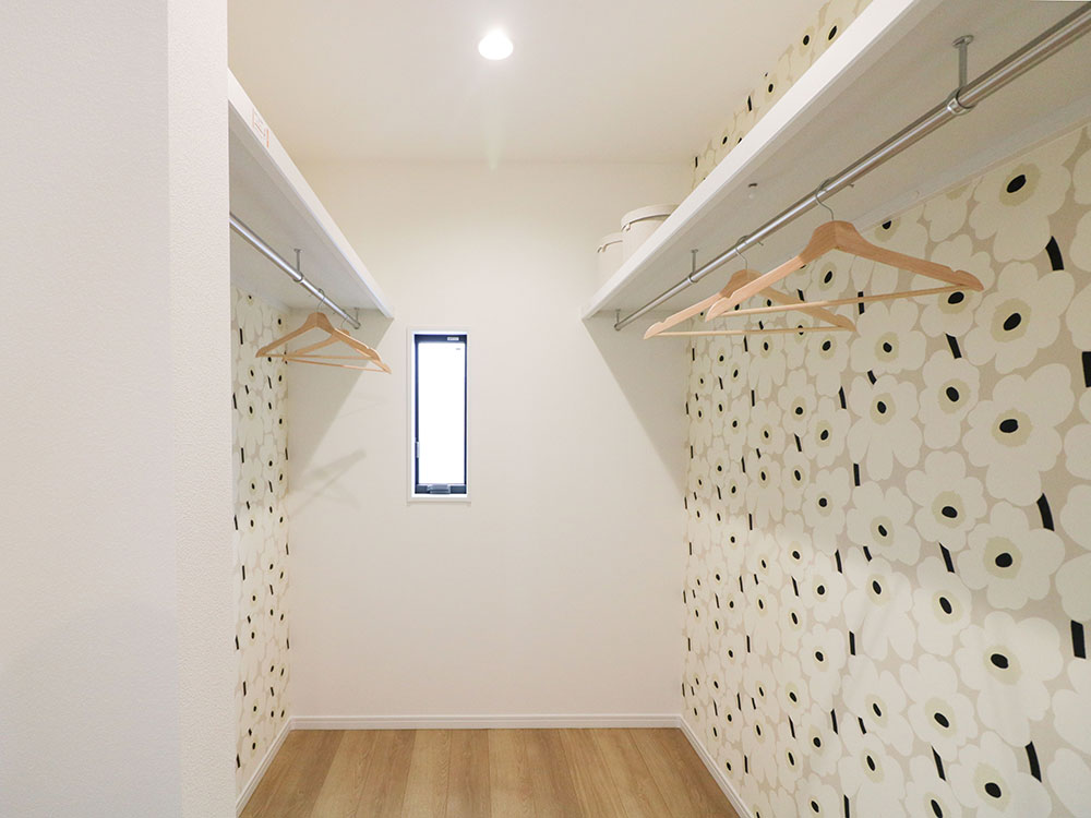 3階には、家族の洋服を一ヶ所にまとめられるファミリークローゼットも設けました。洗濯物を取り込んだ後、家族の洋服を仕分ける手間が省け、家事時間を短縮できます。また、シーズン外のアイテムや寝具、スーツケースなど家族全員の持ち物もたっぷり収納できる便利なスペースです。アクセントクロスは北欧を代表するマリメッコの「ウニッコ柄」。 明るく元気なイメージで洋服選びも楽しくなりそうです。