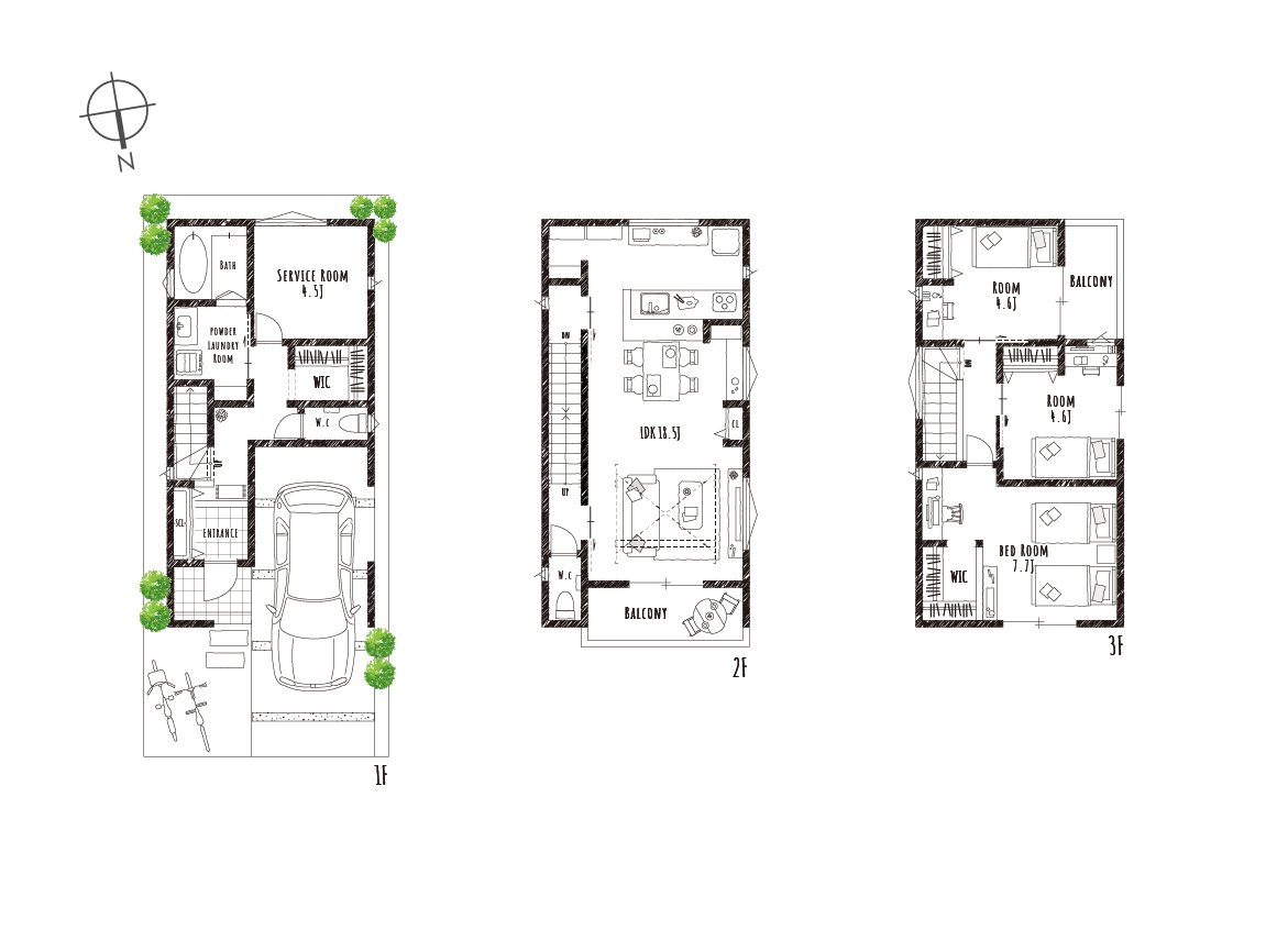 家族が集まるLDKに開放感と奥行きをもたらす、スタイリッシュなデザインの天井が印象的なお家です。キッチンは折り下げ天井を採用することで落ち着いた雰囲気に仕上げられ、料理がしやすい環境に。リビングは折り上げ天井になっており、視覚的にも広がりを感じられる開放的な設計です。キッチンからリビングへと続く空間は奥行きを感じさせ、全体的に広々とした印象を与えてくれます。また、2つのウォークインクローゼットをはじめ、パントリーやリビング収納など、あらゆる場所に機能的な収納スペースを確保。使ったものをすぐ片付けられるので、いつでもお家をスッキリと保つことができます。18.5帖の広々としたLDKには、さらに広がりを感じられる工夫を随所に凝らした、のびやかで快適な毎日を過ごせる住まいです。