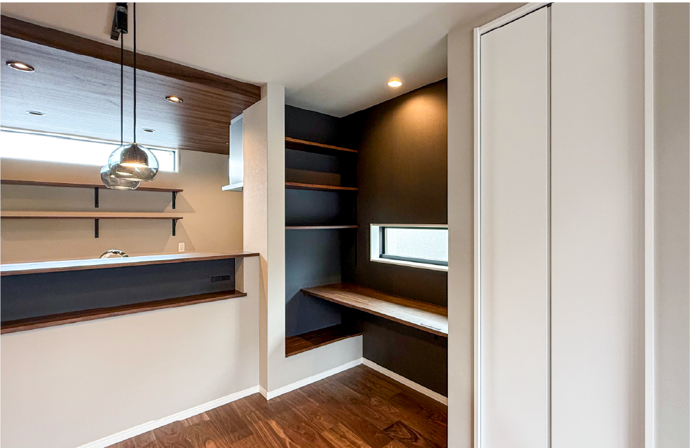 キッチンの上には折り下げ天井を取り入れ、リビング・ダイニングと緩やかに空間を分けています。落ち着いた雰囲気の中で、リラックスしながらお料理を楽しむことができます。隣には可動棚付きのパントリーを設けているので、食材や日用品をスッキリと収納でき、とても便利です。