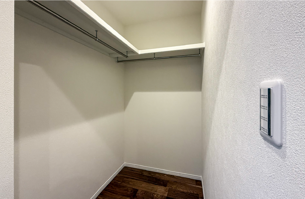 ご夫婦の衣類や小物類をはじめ、スーツケースのような大きなものも収納できるウォークインクローゼットを設けました。この広々とした収納スペースにより、室内をスッキリと快適に使うことができます。また造作のカウンターは、書斎スペースやドレッサーなど多目的に活用できます。