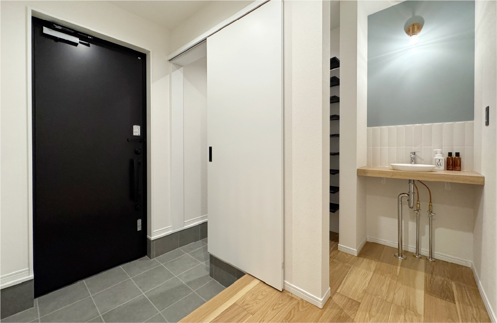階段横のスリット格子から、光が差し込む明るい玄関。「来客用」と、シューズクローゼットを通る「家族用」で使い分けられる2WAY仕様にしました。スライドドアを閉めてサッと隠すことができ、急な来客でも慌てず、気持ちよく出迎えることができます。また、帰宅してすぐ手を洗うことができるよう、マットな質感のタイルをあしらった手洗いカウンターを備えました。お客さまも気兼ねなく洗面台を使ってもらうことができ、お子さまも「帰ってすぐの手洗いうがい習慣」が身に付きますね。