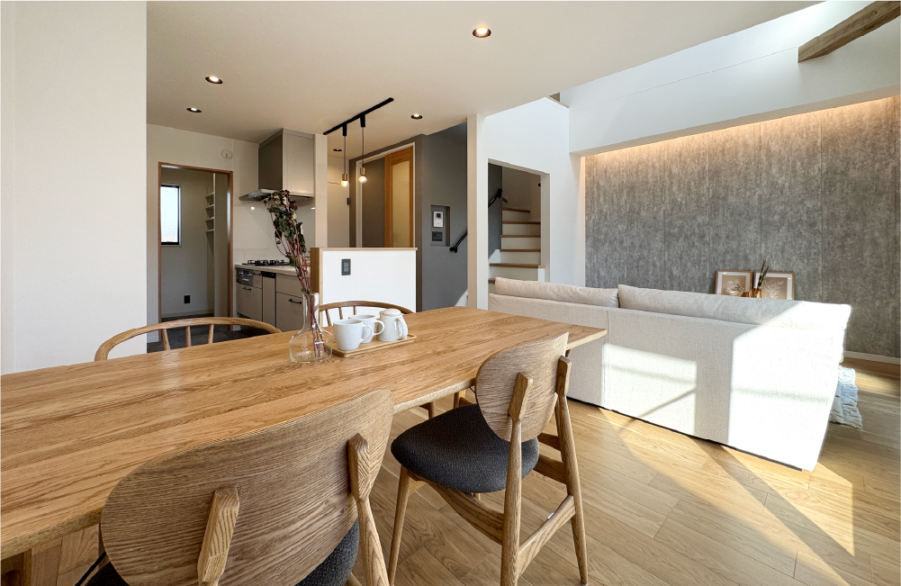 見た目も住み心地にもこだわったお家が完成します。シーリングファンが回る吹抜けと、リビング階段のある開放的なLDKは、落ち着いたグレーのアクセントクロスと間接照明で、ゆったりとくつろげる上質な空間に仕上げました。来客用と家族用で分けた2WAY仕様の玄関は、いつでもスッキリとした状態でお客さまをお出迎え。玄関に設けた手洗いカウンターのタイル装飾や洗面ボウル、キッチン〜洗面室の床はグレーのフロアタイルにするなど細部までこだわりました。水回りは生活感を隠すランドリースペースと回遊動線で、家事ラクを実現。適材収納できちんと片付けができ、いつでも部屋をきれいに保てるようになっています。機能性とデザイン性、生活のしやすさと非日常のリラックス感を味わえるお家です。