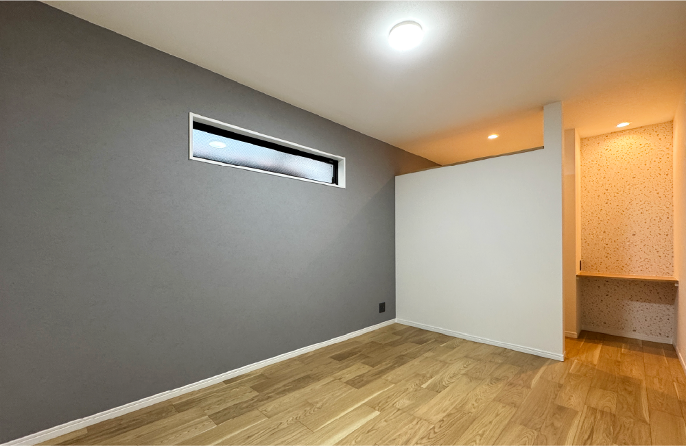 主寝室に備えたウォークインクローゼットは、壁と天井の間を少しあけたオープンタイプにし、お部屋を広く感じられるようにしました。クローゼットの横には、便利に使えるカウンターを備え、服やメイク、ヘアスタイルも一緒に整えられます。お出かけ前の準備は素早く、寝る前のスキンケアはゆっくりとできますね。グレーとテラゾー柄のアクセントクロスを使って、上質で洗練された空間に仕上げ、一日の疲れを寝室でゆっくり癒せそうです。