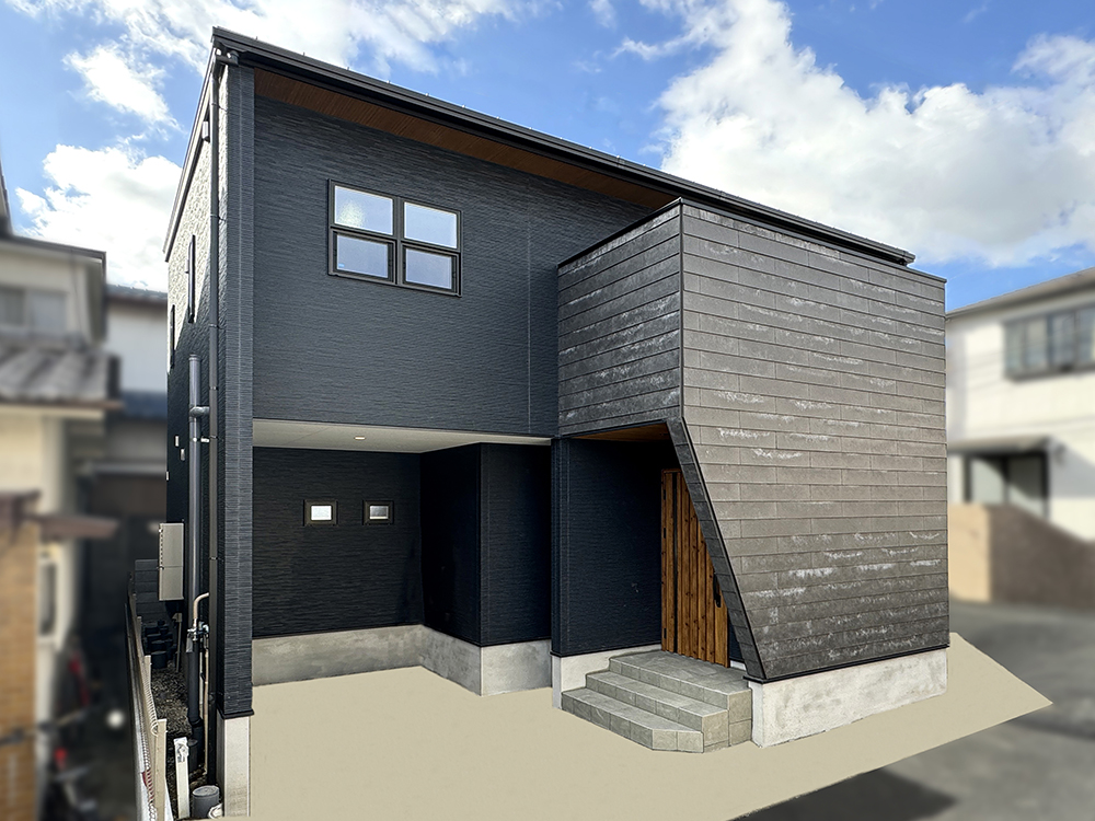 ネイビーをベースに、セメント質感の外壁材や木目調の軒天など、異素材を組み合わせた、スタイリッシュで個性的な外観。玄関ドアを前面道路から見えない位置につけることで、プライバシーが守られ、見た目もすっきり。また、玄関アプローチの壁を斜めにすることで、圧迫感なく、駐車ができます。
