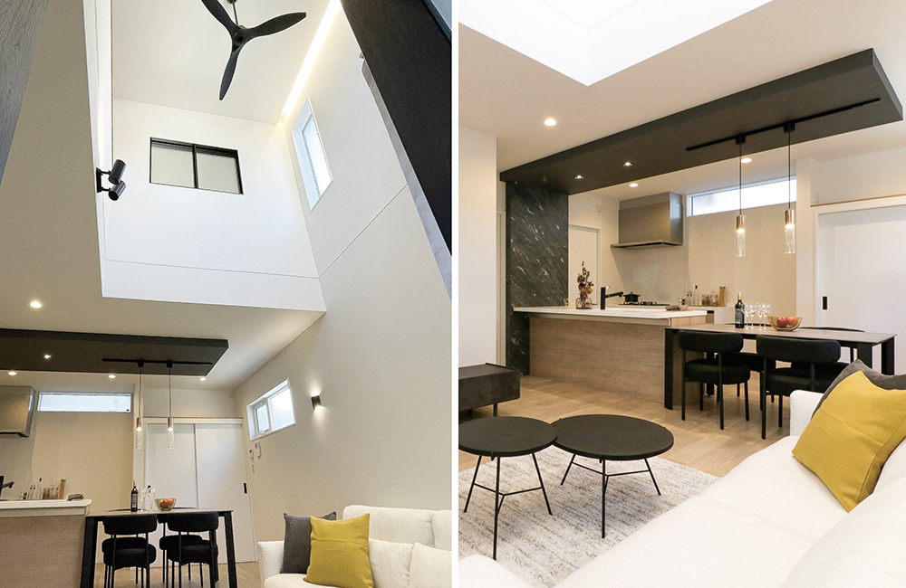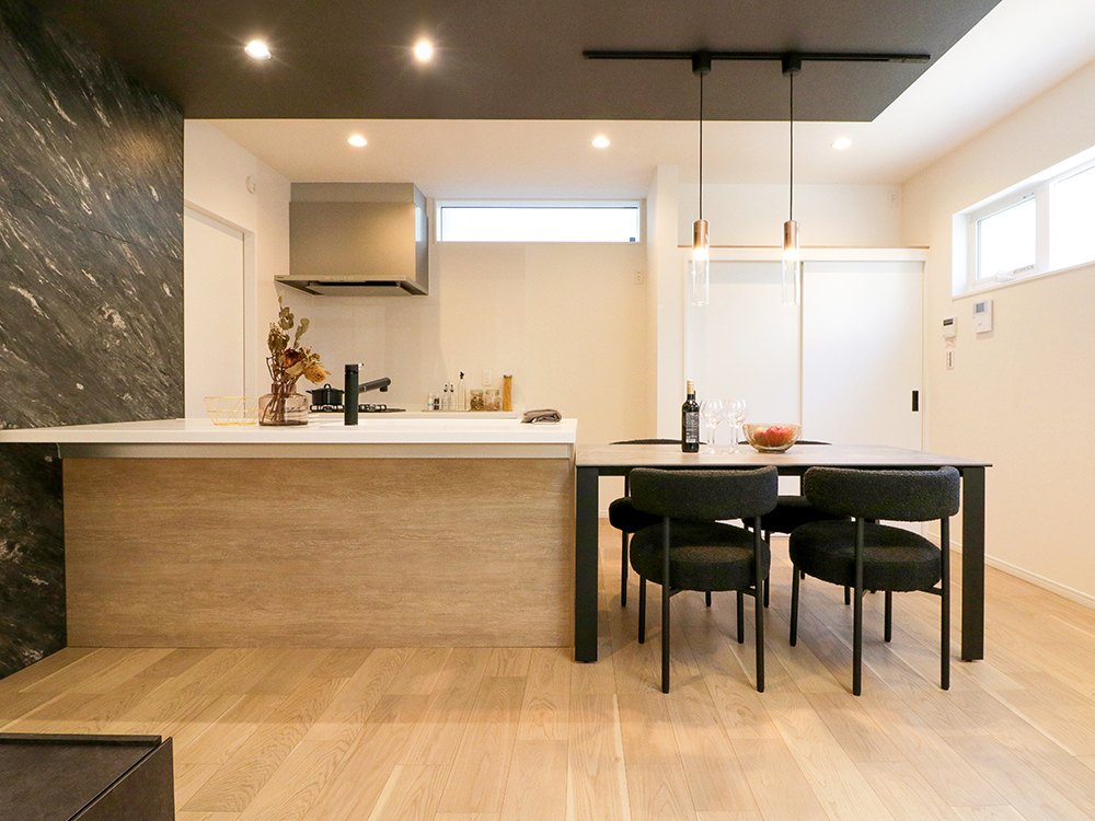 高低差のある敷地だったので、玄関アプローチのスペースを確保できるよう工夫をしました。LDKに明るく安定した光を取り込めるよう、大きな吹抜けを設け、そこに室内窓を取り入れる事で、上下階の一体感を持たせました。また、外観・内観はともに、上質さとカッコ良さを取り入れたデザインに仕上げ、動線や収納計画にもこだわった、個性的で暮らしやすいお家をつくりました。
