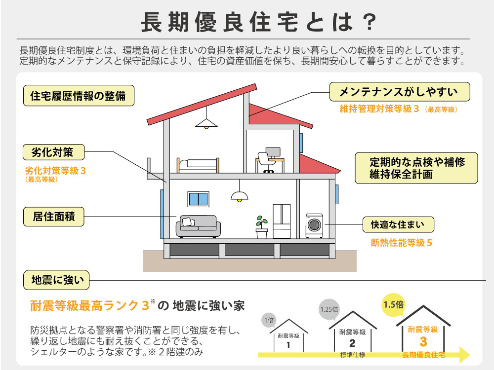 長期優良住宅とは、国が定めた基準をクリアした、長く安心・快適に暮らせる家のこと。長期間安心して暮らせるだけでなく、住宅ローン控除・不動産取得税・登録免許税・固定資産税の減税などの優遇が受けられます。また、断熱性が高く、結露が生じにくい樹脂サッシの使用や、耐震等級3の取得、家の損傷を抑える制震ダンパーの採用など、快適な住環境を確保し、地震や台風などの災害から家族を守る、本来の住宅としての役割が考えられたお家です。